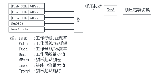 >頻壓起動。頻壓起動主要用于進線電流很小,進線電源因各種原因消失后,工作負荷孤網運行,母線的頻率會偏離工頻,此時無流起動和逆功率起動不適合,其邏輯圖如下。