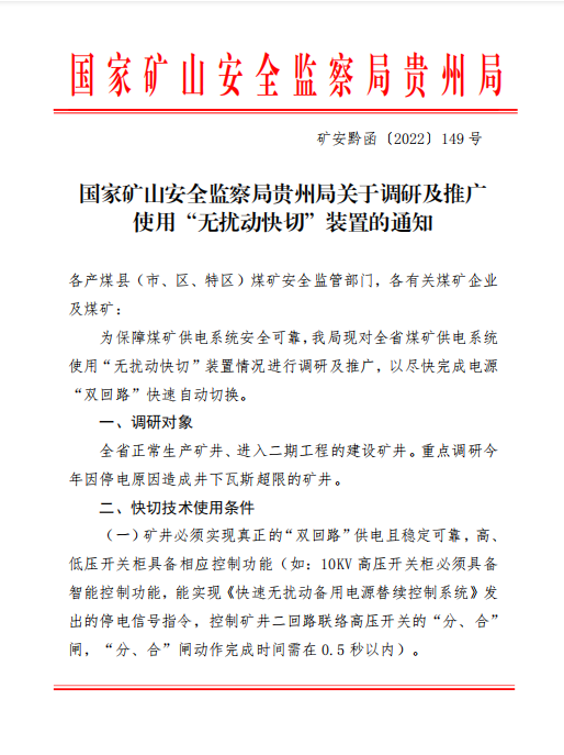 國(guó)家礦山安全監(jiān)督局貴州局高度重視省內(nèi)煤礦企業(yè)的供電安全可靠問(wèn)題,通過(guò)大量調(diào)研驗(yàn)證,發(fā)布149號(hào)文,大力推廣煤礦供電系統(tǒng)“無(wú)擾動(dòng)快切”改造,保證礦井的連續(xù)供電能力。