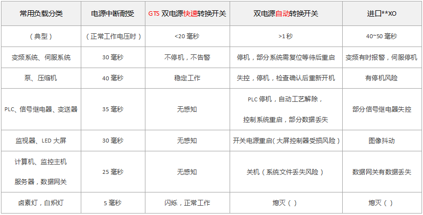 GTS雙電源快速轉(zhuǎn)換開(kāi)關(guān)不同于普通ATS雙電源自動(dòng)轉(zhuǎn)換開(kāi)關(guān)應(yīng)用在當(dāng)常用電源發(fā)生晃電故障時(shí)通過(guò)備用電源快速安全切換,來(lái)確保負(fù)載連續(xù)供電。常規(guī)ATS(雙電源自動(dòng)轉(zhuǎn)換開(kāi)關(guān))因采集、控制、滅弧工藝等限制,備用電源安全投入需等待數(shù)秒甚至數(shù)十秒時(shí)間,大多數(shù)負(fù)載尤其是工業(yè)連續(xù)負(fù)載如:電機(jī)、變頻、PLC控制及各類(lèi)自動(dòng)化控制系統(tǒng),全部停機(jī),嚴(yán)重影響安全生產(chǎn)、經(jīng)濟(jì)效益甚至引發(fā)生產(chǎn)事故。